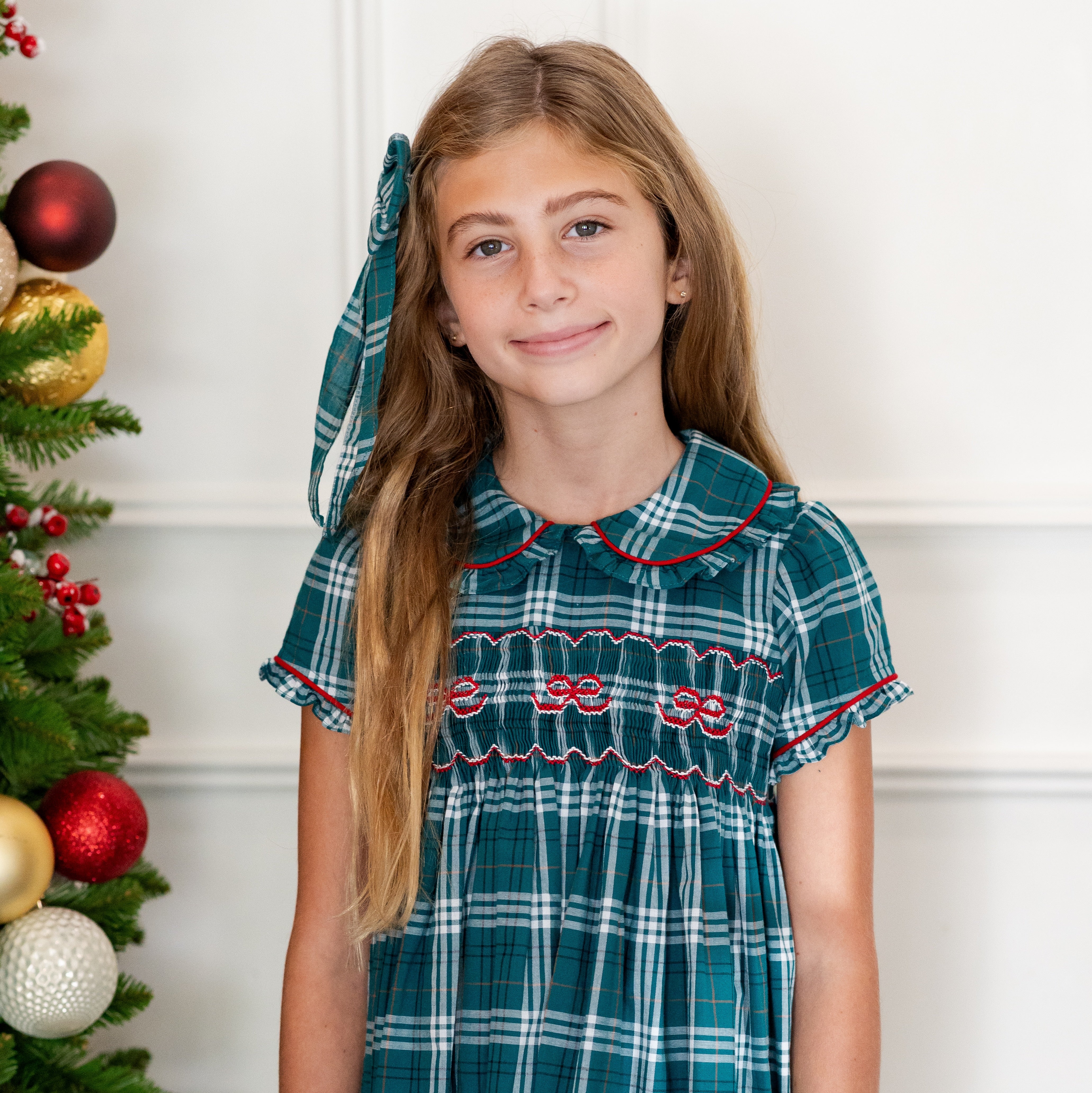 Our Ariella Girl Dress - Green Tartan captures the essence of the holiday season with delicate hand-smocked bows on the chest, made from stunning green tartan fabric. The Peter Pan ruffle collar and vibrant red piping add a lively, festive touch to this charming piece. Complete the full family look with matching sibling styles in the same delightful print, creating a coordinated holiday ensemble that’s perfect for all your special moments together!