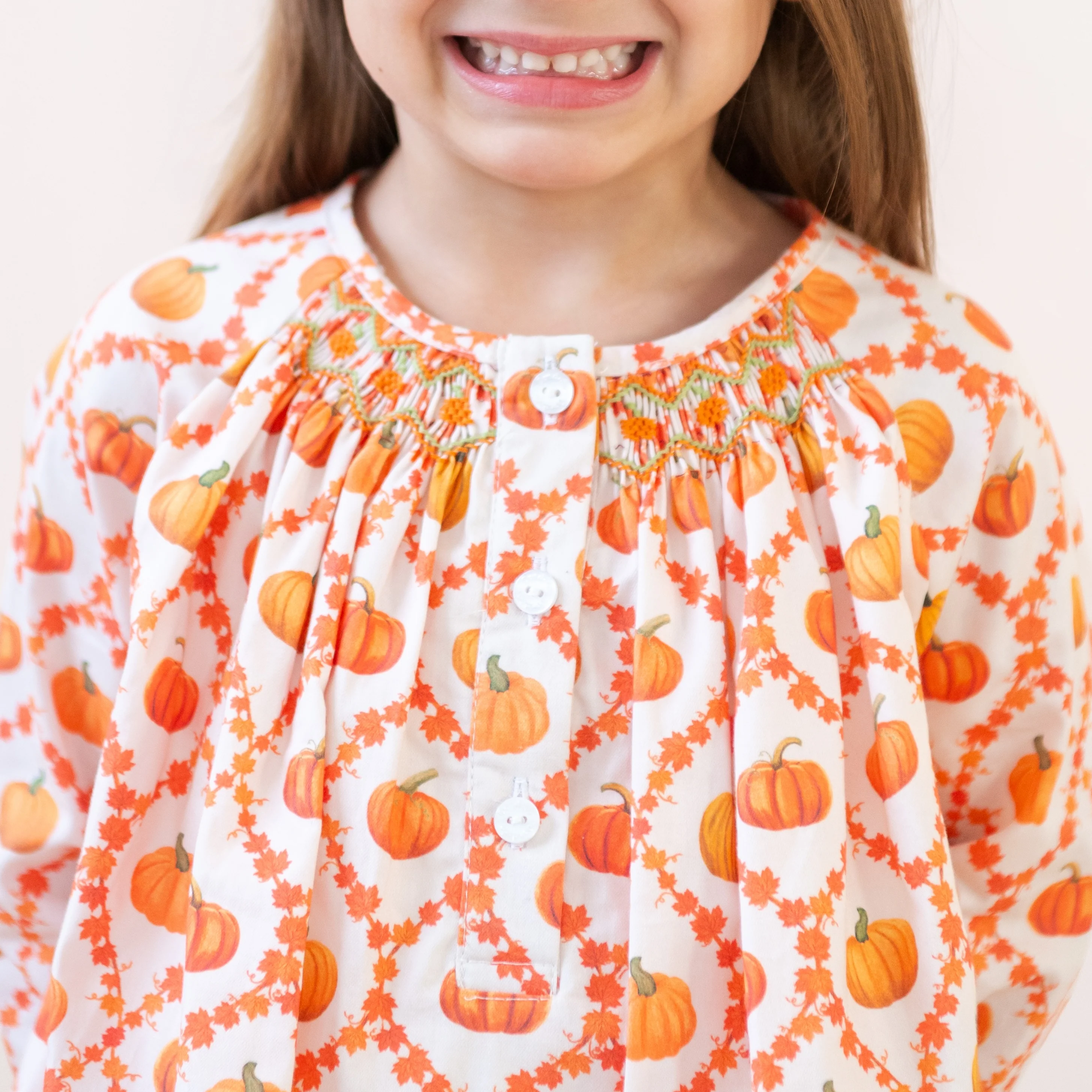 This long-sleeve hand-smocked dress is a favorite for the season. Featuring a playful print of pumpkins and autumn leaves, it captures the spirit of crisp fall days. The detailed hand-smocked front adds a vintage-inspired touch—perfect for pumpkin patch visits, seasonal gatherings, and fall family photos.