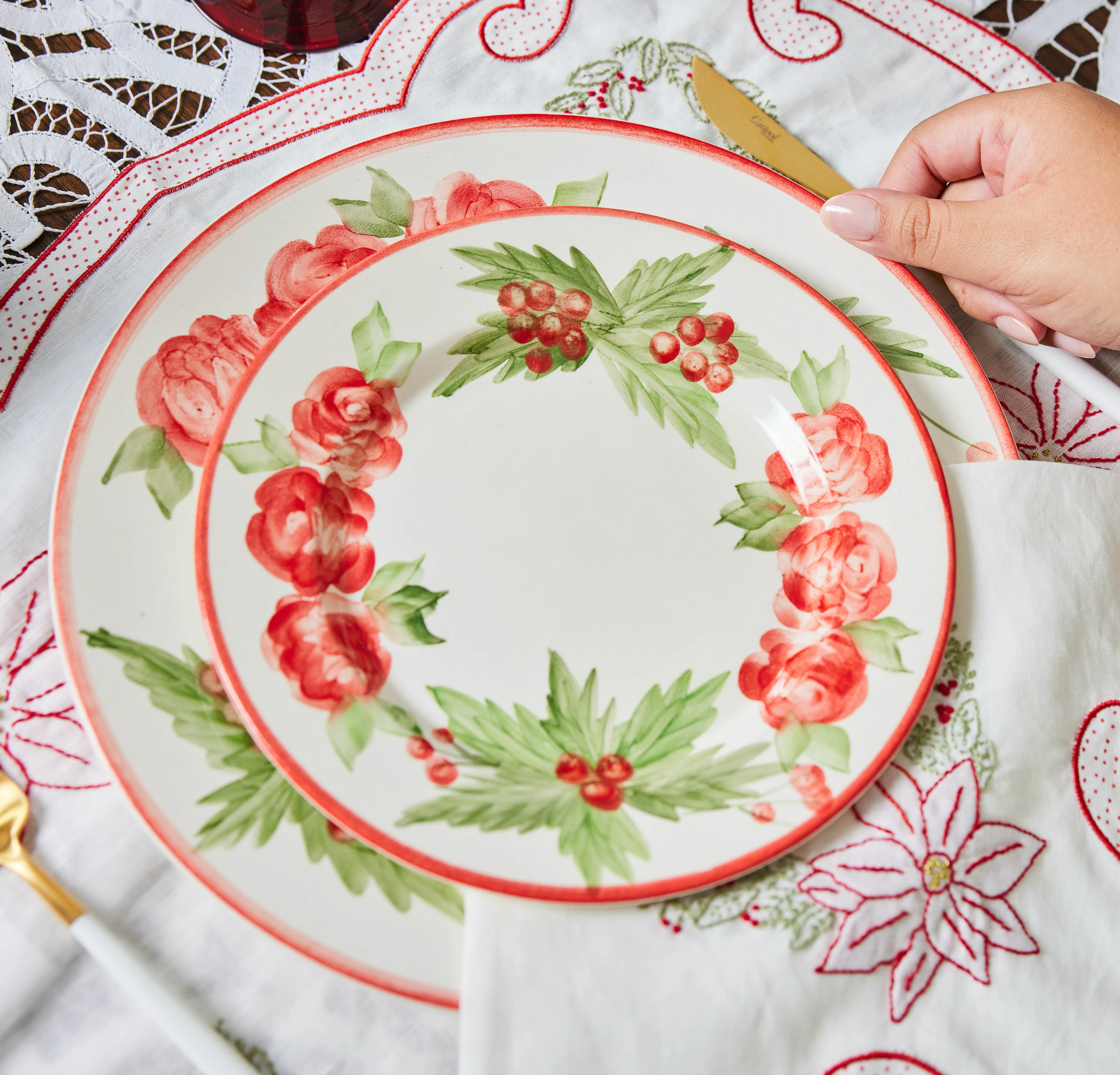 The Dondolo Holiday Home Collection includes stunning hand-painted ceramic plates with seasonal red florals, hollies and winter greenery. The Christmas Blooms Dinner and Salad Plates pair perfectly with our collection of complimentary Christmas embroidered napkins and placemats. We look back at the many milestones of this past year and toast to happiness, good will, and light to all our Dondolo Moms as we approach the new year!
