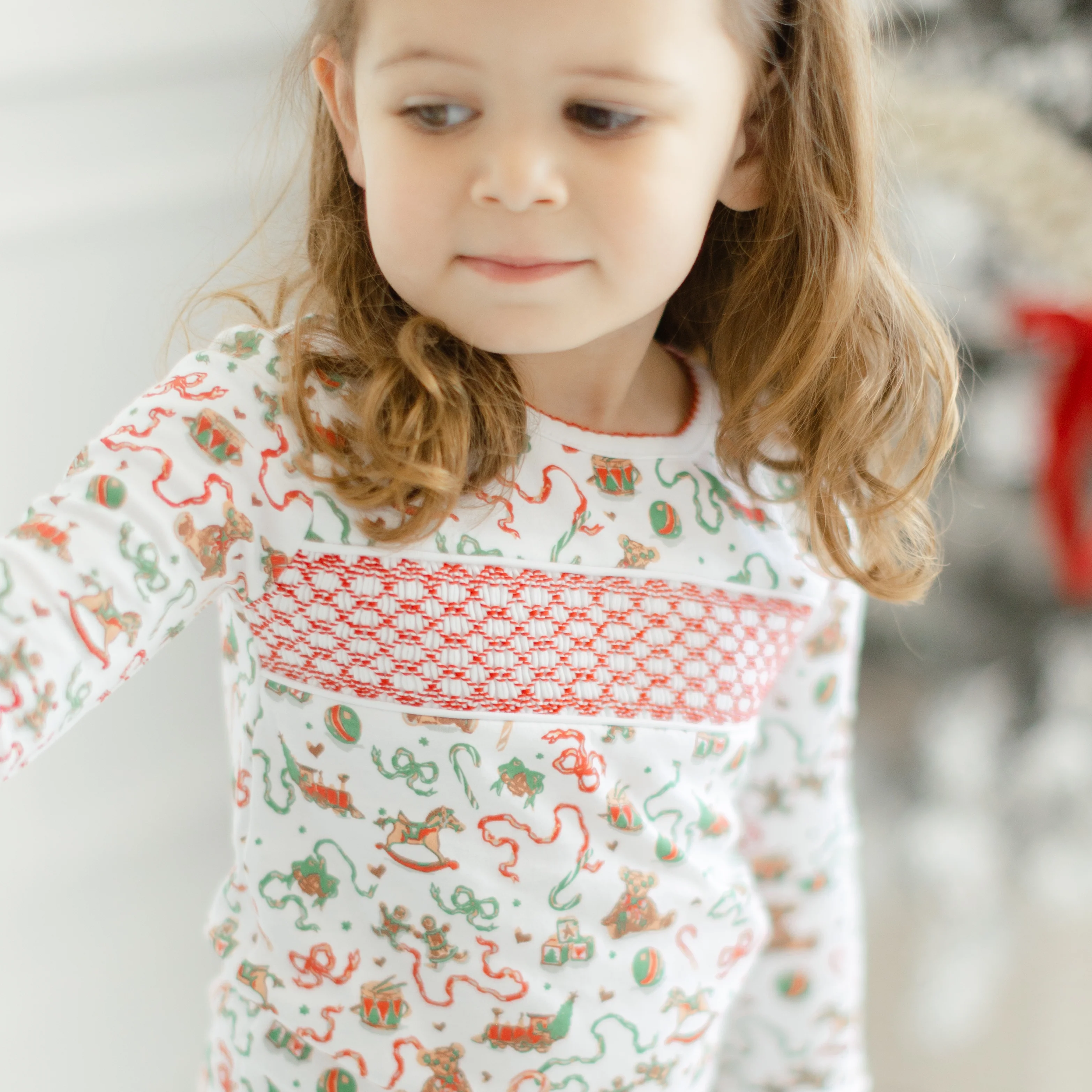 There is nothing like getting your babies in matching cozy pjs and setting out milk and cookies for Santa and carrots for his reindeer. Then, the feeling of tiny little feet running to the living room to see what Santa left behind while they were sound asleep. Our Pjs are incredibly soft and sweet, with whimsical illustrations of Christmas favorites by Artist Ashley Begley. We couldn’t help but add Dondolo’s signature smocking details, using white and red thread that resembles a candy-cane trellis on a gingerbread home.
