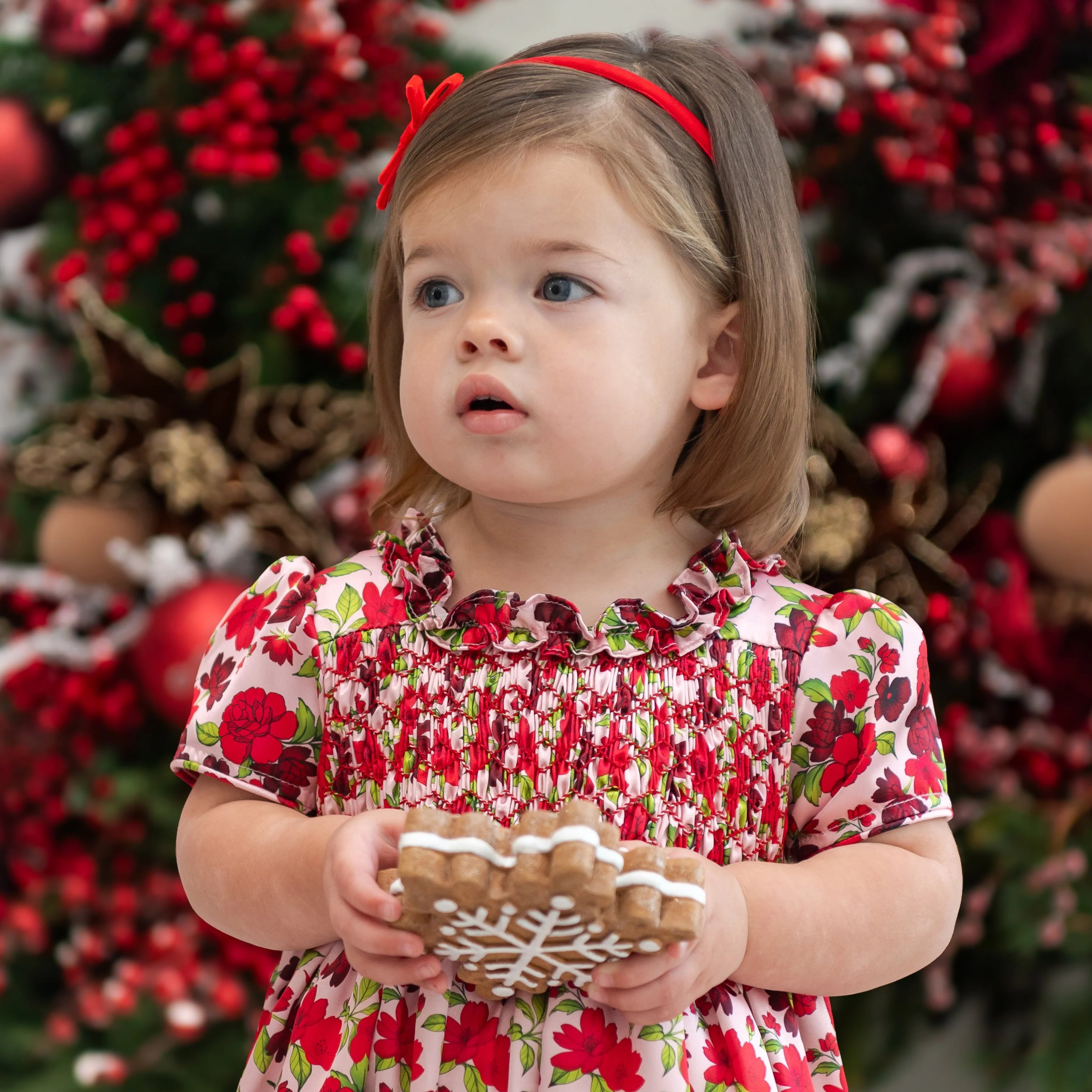 Step into a world of festive elegance with our Holly Girl Bubble. Crafted from luxuriously soft silk satin, this style is as easy to care for as it is beautiful. The design features a delicate frilled neckline, a gathered bodice, and a charming trellis smock, creating a timeless holiday look your little one will adore.