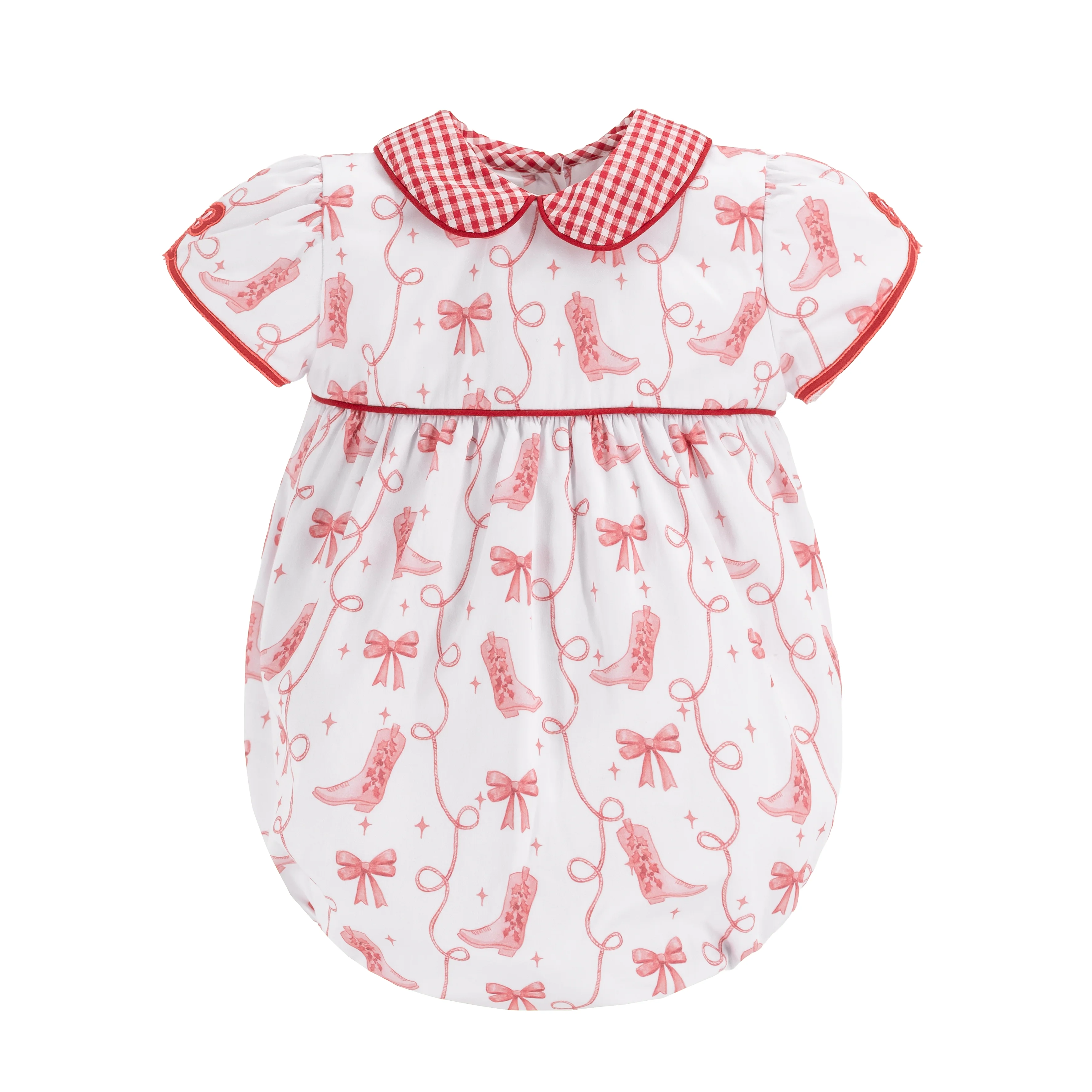 A standout piece in our collection, the Jessie Girl Bubble - Holly blends refined craftsmanship with spirited charm. Featuring a custom-illustrated print by artist Ashley Bonovitch, this heirloom-quality bubble tells a story of holiday cheer and playful cowgirl adventures. Every detail—from the gingham Peter Pan collar to the hand-embroidered heart sleeves—has been thoughtfully designed to delight. The back reveals a showstopping appliqué: cowgirl boots adorned with Christmas hollies. Perfect for Christmas parties, tree lighting ceremonies, and everyday winter adventures, this bubble is more than just a wardrobe piece—it’s a memory in the making, destined to be handed down and loved again.