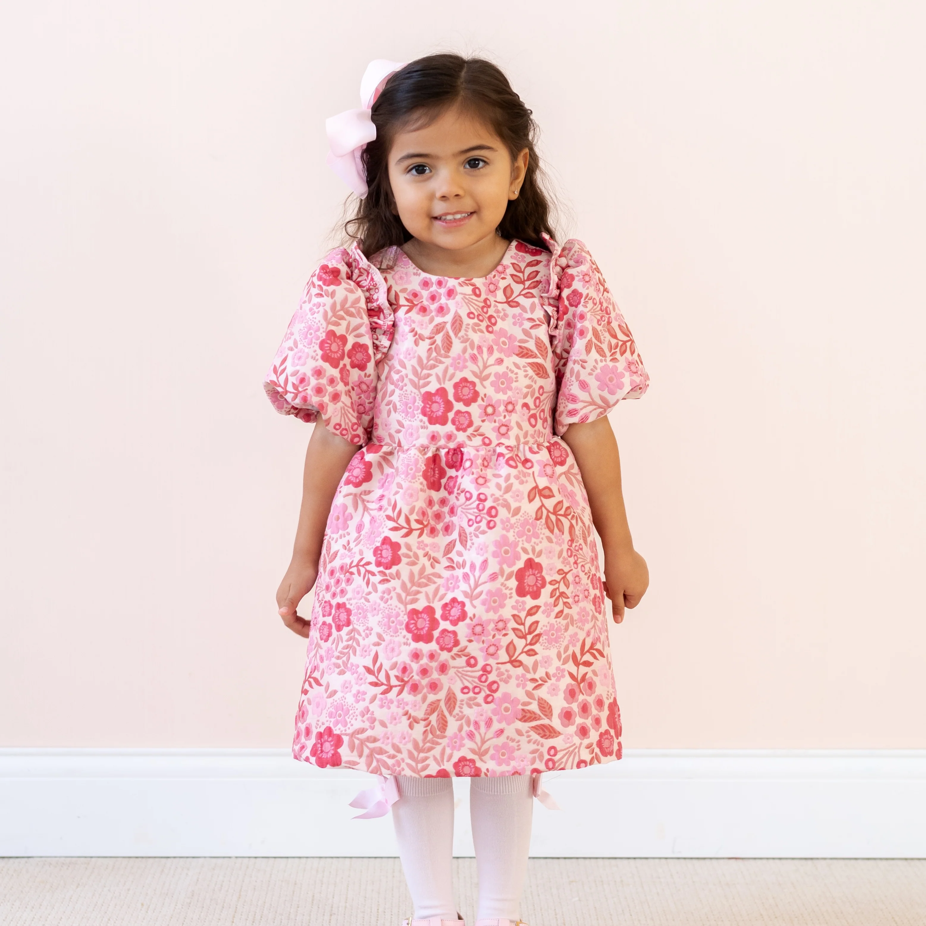 Introducing the Layla Girl Dress, a timeless piece designed for elegant holiday celebrations. Made from luxurious jacquard fabric adorned with delicate winter florals, this dress is as festive as it is refined.