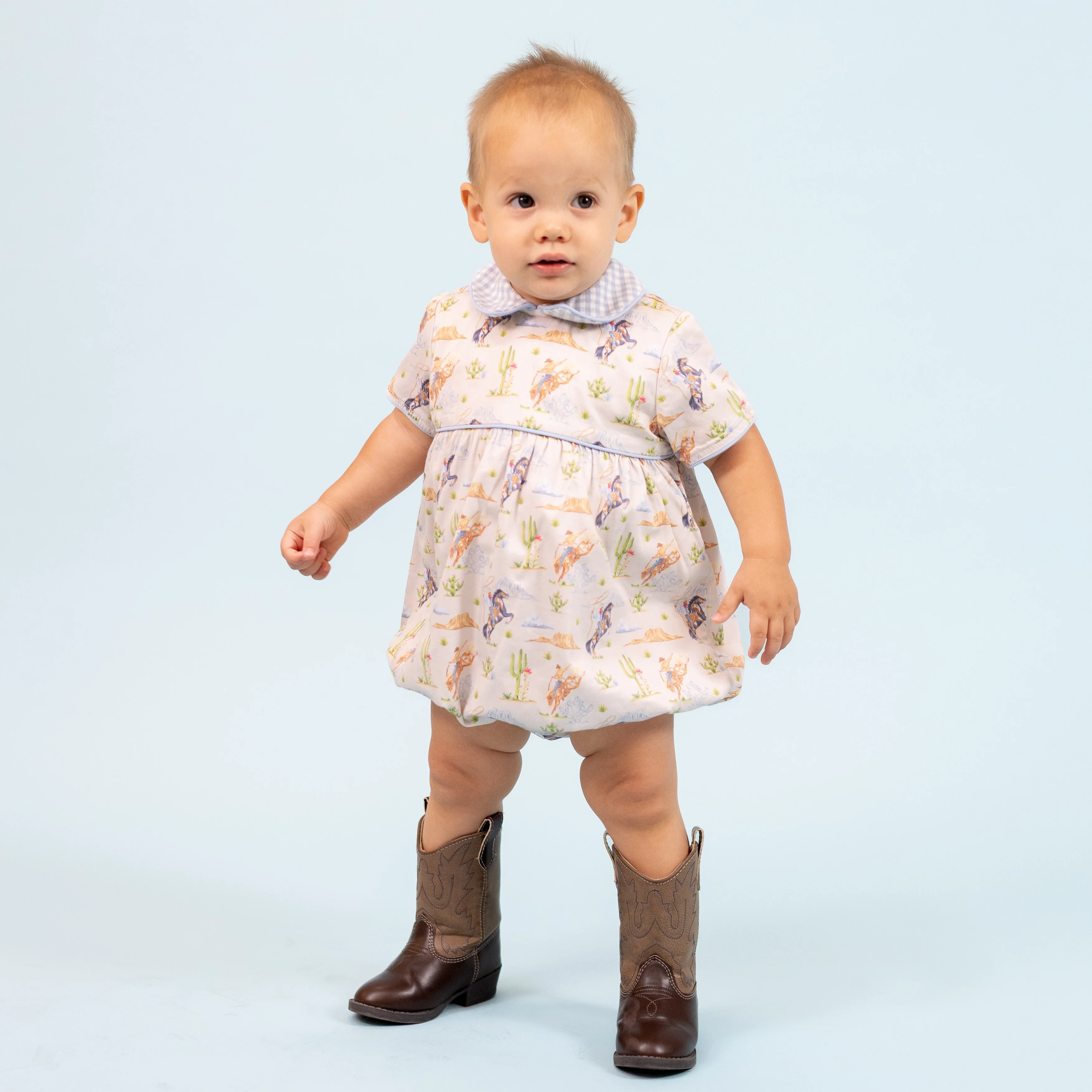 A true keepsake, the Sawyer Boy Bubble brings a sense of storybook charm to your little one's wardrobe. Illustrated by the esteemed Catherine Cartie, the exclusive print captures playful cowboy adventures across wide-open desert scenes—complete with cacti, lassos, and galloping steeds.