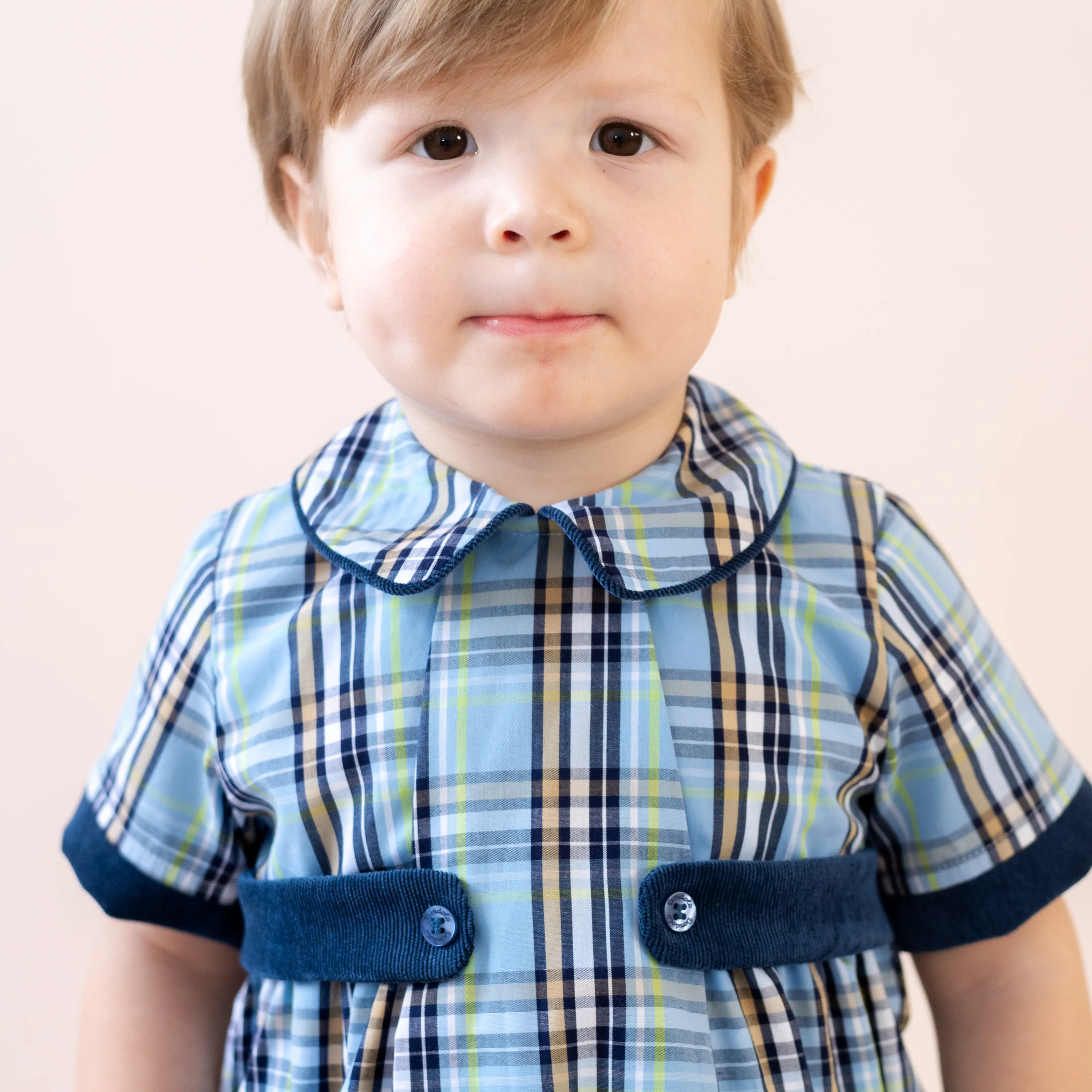 A fresh take on fall classics, this tailored bubble is crafted in a handsome plaid of soft blues, greens, and golden hues—perfect for the season. Thoughtfully designed with short sleeves and rich navy corduroy trim, it blends comfort with timeless style. Navy buttons and a crisp Peter Pan collar add a vintage-inspired touch, while pleated detailing gives it a polished finish. Whether it’s for family photos or festive gatherings, this adorable bubble is sure to be a standout in your little one’s fall wardrobe.