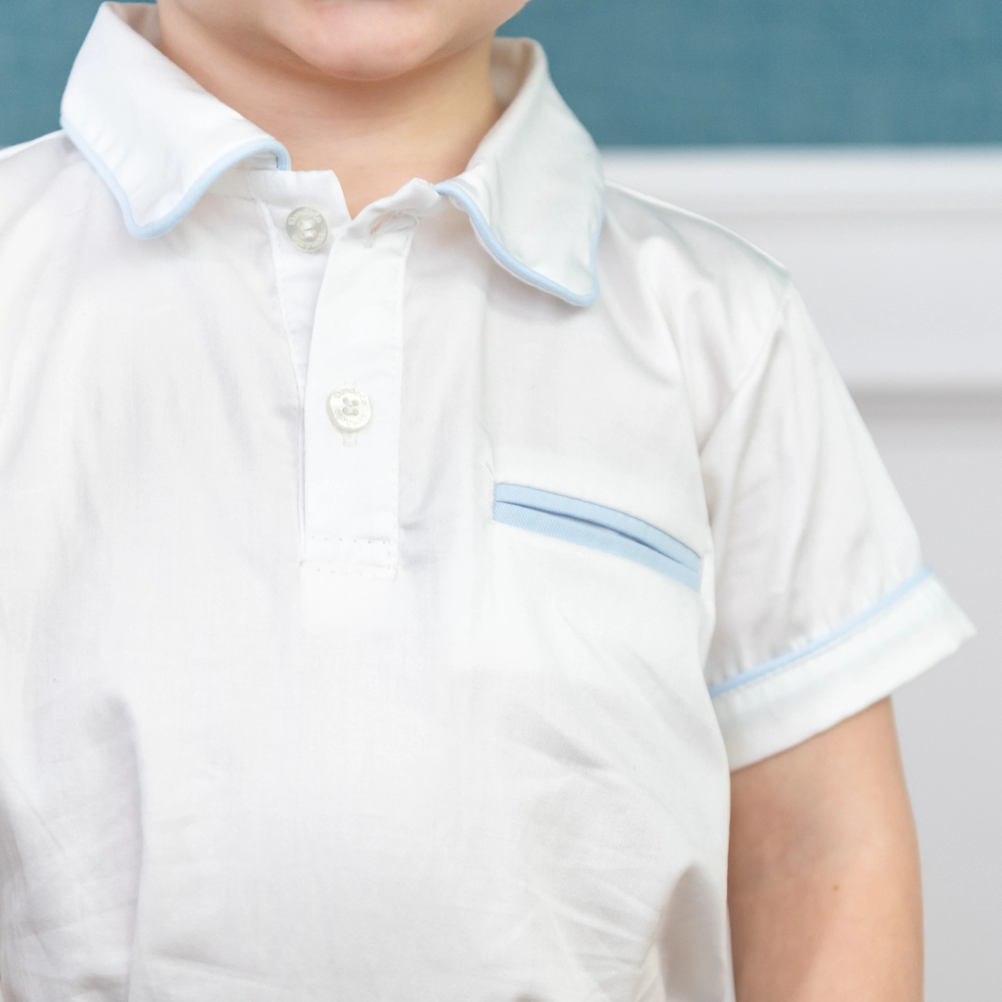 Celebrate Easter in style with our William Boy Polo Set with a classic swiss dot fabric and solid white polo with detailed piping. This traditional silhouette is extremely versatile and perfect for older boys and all of their favorite Easter activities.. Be sure to check out the other items in this family for a matching Easter moment with siblings.